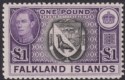 King George VI Arms of the Falkland Islands £1 grey-black and bluish violet mint. The third printing on greyish paper. Mounted mint.