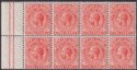 King George V watermark Multi Crown CA 1d orange-vermilion on white paper marginal block of 8 mint. Unmounted mint.