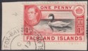 King George VI 1d black and vermilion used on piece. With flaw on King's face variety. Fox Bay postmark. Stamp with several perf tones.